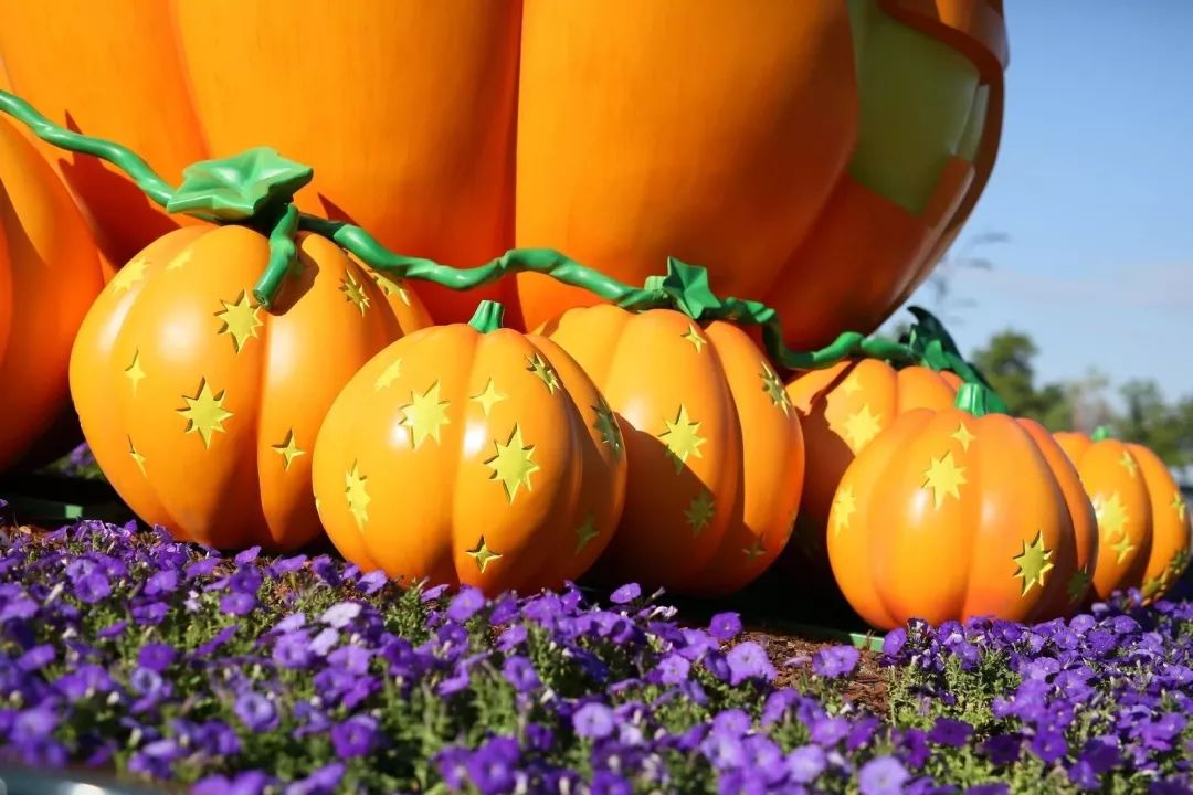 超级大的巨型南瓜灯底下,紫色的花海围绕着