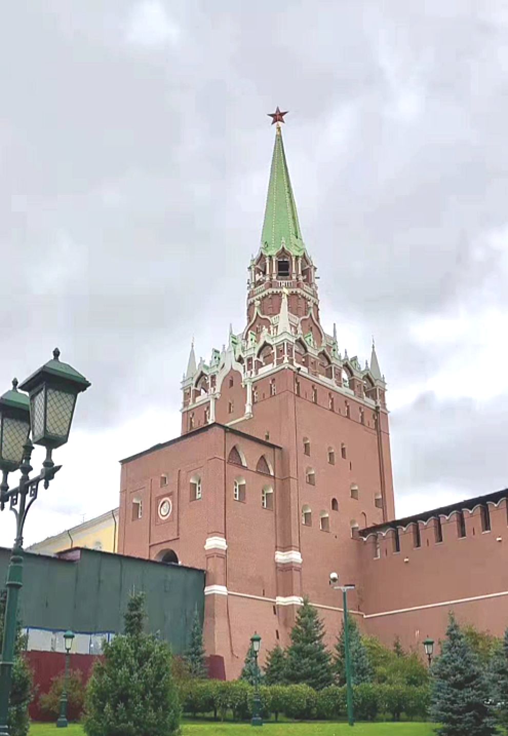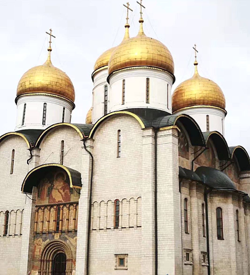 远望整个克里姆林宫,建筑色彩缤纷,教堂的金顶,塔楼的红宝石星,白色的宫墙,绛红色的城墙,红绿相间的花园相和谐。大大小小的宫殿和教堂共沐历史的光辉,演绎着百年深沉的异国历史和文化情怀。