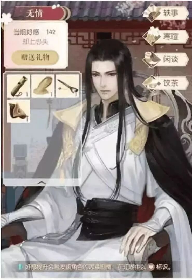 在茶楼中,选择对应角色,赠送礼物(奇物),赠送的奇物可以通过游历获得好感度达到一定要求后,通过寒暄、闲谈、饮茶也可以提升好感度。