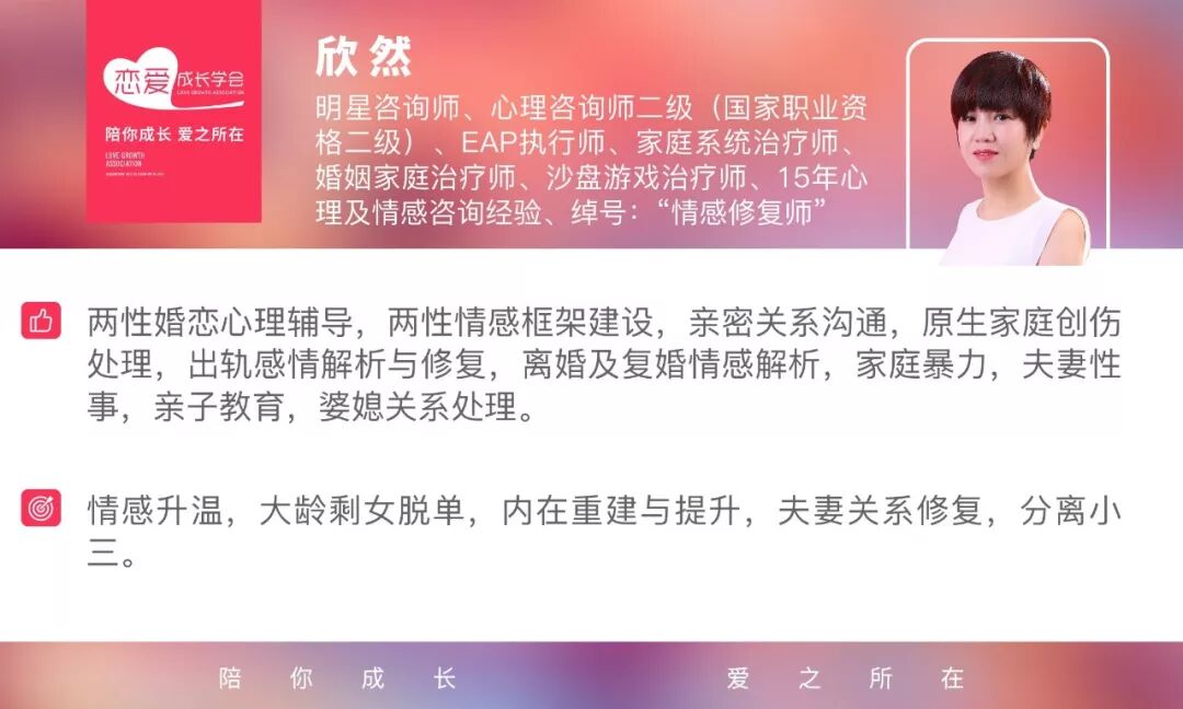 欣然: 恋爱咨询、夫妻家庭关系、亲子关系、 婚姻危机等。