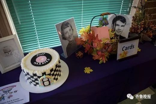 婚礼后,他们在一家上世纪50年代风格的餐厅举办了婚后宴会。他们的结婚蛋糕旁,摆放着两人十几岁时的照片。