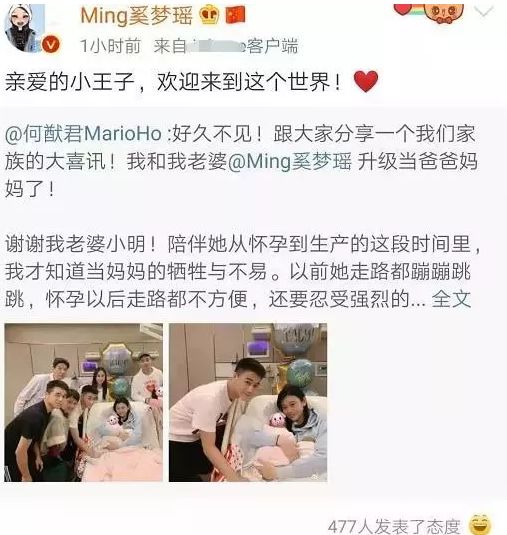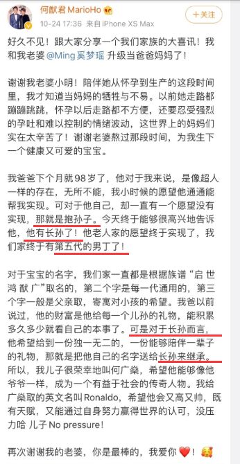 何猷君也发长文表达自己的喜悦之情,除了提及老婆奚梦瑶,感谢她辛苦怀胎生下儿子,文中自然不会忘记提起自己的赌王老爸,尤其多次强调“长孙”。