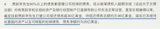 10月14日,贾跃亭债务处理小组发表《声明》,称“贾跃亭先生90%以上的债务都是替公司担保的债务”“截至目前,贾跃亭先生已替公司偿还债务超30亿美金, 待偿还债务总额约为36亿美金,减去已冻结待处置国内资产以及可转股的担保债务,债务净额约为20亿美金。”