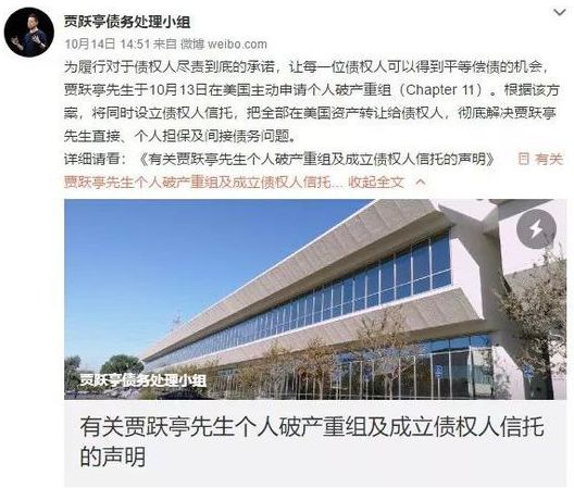 广东东方金源律师事务所高级合伙人 金焰:如果在美国当地申请个人破产的话,就能起到一箭双雕的作用,既防止了美国债权的追偿,也防止了内地的债权人去美国,起诉执行他在美财产。贾跃亭在国内的债务,仍然依法依规地在法院审理进行,如果法院有判决执行的话,仍然是按照中国法律进行相应的处理,与美国他的破产是没有因果关系。