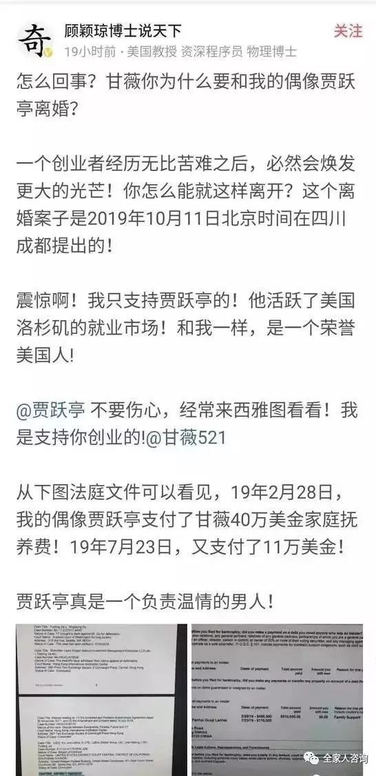 2019年10月19日晚间,与贾跃亭有诉讼历史的顾颖琼再次曝出大料。曝光的法庭文件显示,2019年10月11日贾跃亭和甘薇已经在成都锦江区人民法院申请离婚,状态是处理中。爆料人顾颖琼是谁?先跟大家科普一下,2017年7月,贾跃亭被顾颖琼在微信公众号中曝光过位于美国洛杉矶的豪宅等信息,贾跃亭向洛杉矶当地高院对顾颖琼发起诉讼,并向法院申请了针对顾的临时禁令。