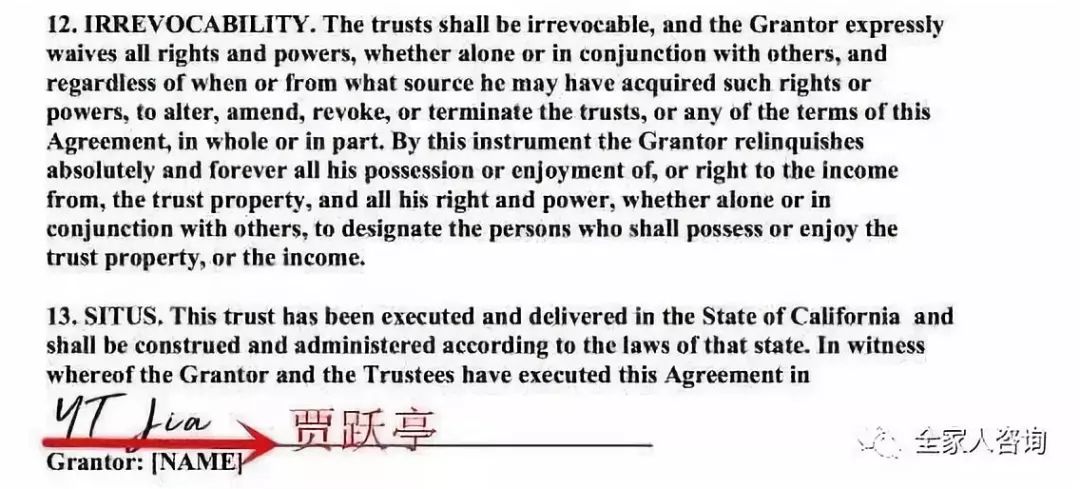 根据留美工程师顾颖琼博士从洛杉矶律师助理手里拿到了贾跃亭的irrevocable living trust 【不可撤销的生前信托】的其中一份草稿文书【信托名字叫THE YT IRREVOCABLE TRUST 】。