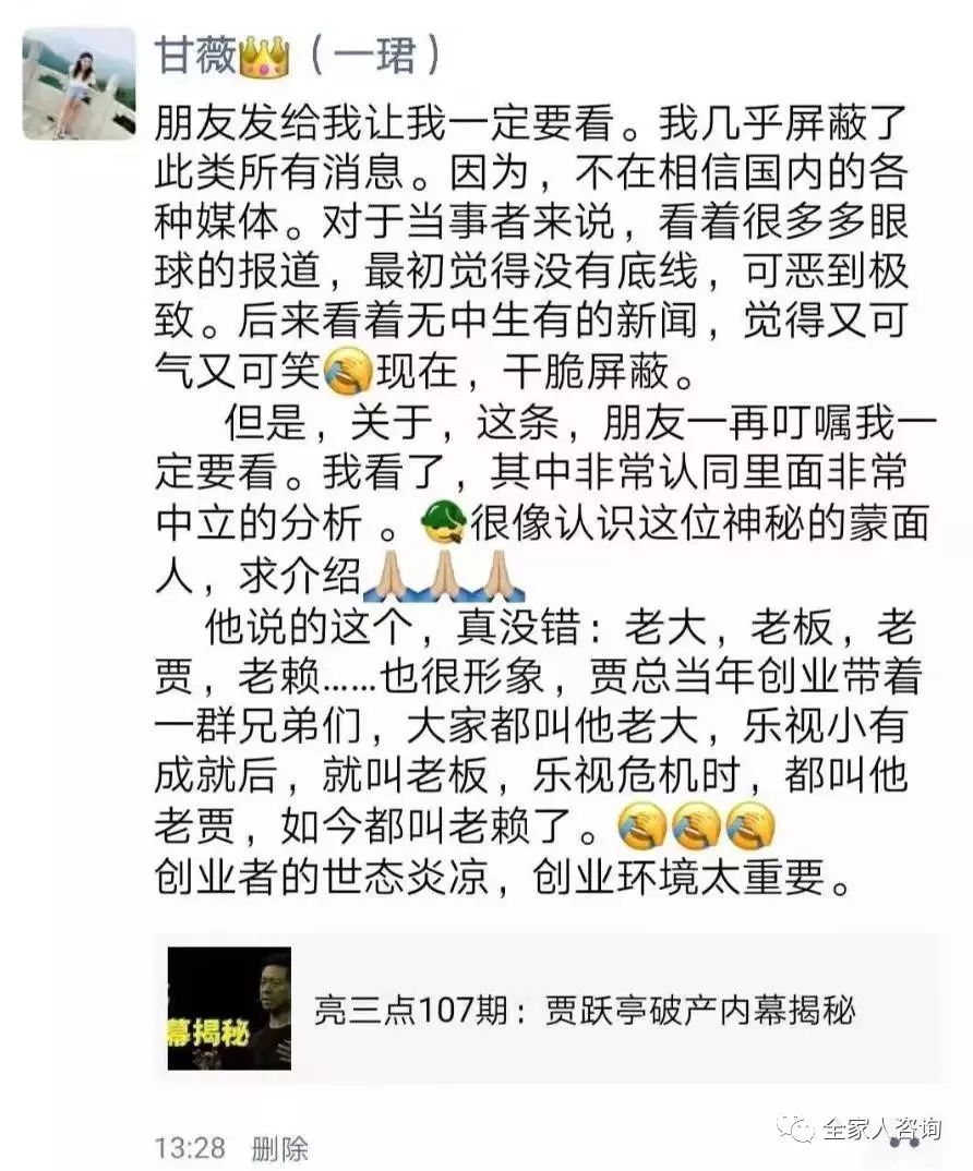 “老贾是一个有梦想的人,原本可以选择一条比较舒适的生活和轨迹创业,但却选择了一条艰难无比的道路创业,为了事业义无反顾。这是老贾的优点,也是他的缺点。今天,老贾阶段性创业失败,很大的问题是他有超越常人的梦想,不断地挑战自我、挑战极限,结果挑战过度。”