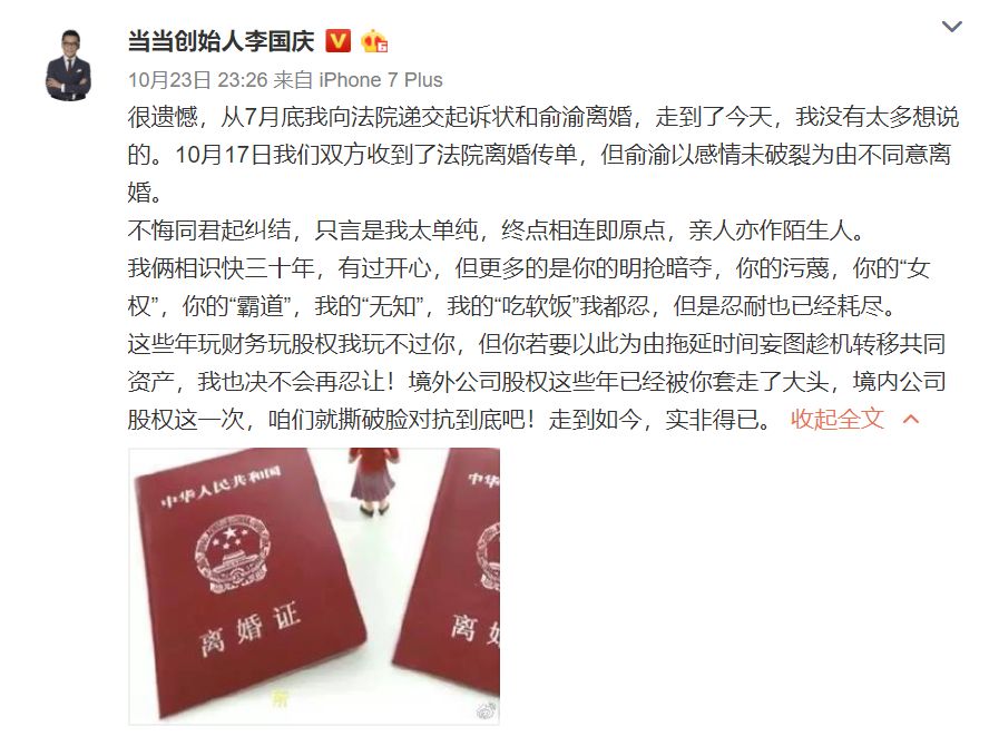 2019年10月23日,一个原本平静的周三,当当网创始人李国庆俞渝夫妇深夜互撕,充斥着同性恋、家暴、出轨等狗血剧情,让不少吃瓜群众唏嘘不已,但该事件引起如此热议,除了狗血剧情外,笔者关注到,两夫妻曾联合创立当当网,此前李国庆虽发声明称已经离开当当网,但从当当网公开信息查询看,李国庆仍然是当当网的股东,并持股27.51%,而俞渝持股达到64.20%,据报道,目前,李国庆已经向法院起诉离婚,在离婚诉讼中,作为夫妻共同财产的当当网股权,将可能成为较大的争议内容,而李国庆也提出平分当当网股权的方案,不管结局如何,都将是对当当网的股权结构一次重大挑战。