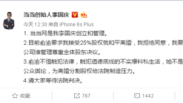 10月24日午间,李国庆再发微博称:“1、当当网是我李国庆创立和管理;2、目前俞渝要求我接受25%股权就和平离婚,我拒绝同意,我要求平分,平分后公司谁管理尊重全体股东决议;3、俞渝不惜触犯法律,触犯道德底线的不实爆料私生活,她不是病了,希望影响公众舆论,为离婚分割股权给法院制造压力;4、请大家等待法院判决。”