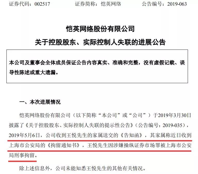 这一次又是上市公司恺英网络的董事长被抓了,为什么基金君要说"又"呢?因为不久前,这家公司的80后实控人王悦已经被抓了,这一次轮到了董事长。