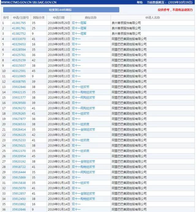 目前,通过商标局网站查询“双十一”相关的商标,可以查找到144件,其中大部分都是阿里巴巴公司提交申请的。(涵盖各个状态的商标,并非全部成功注册)