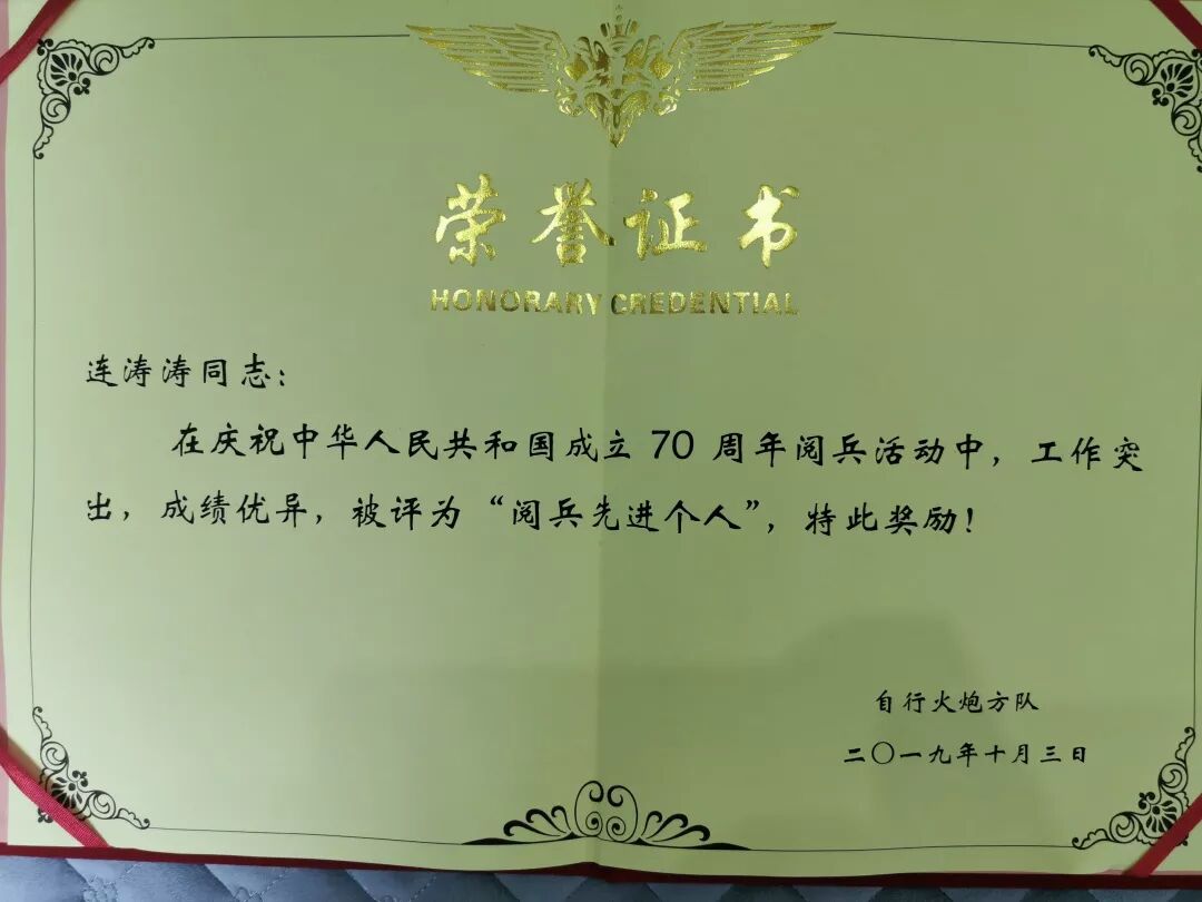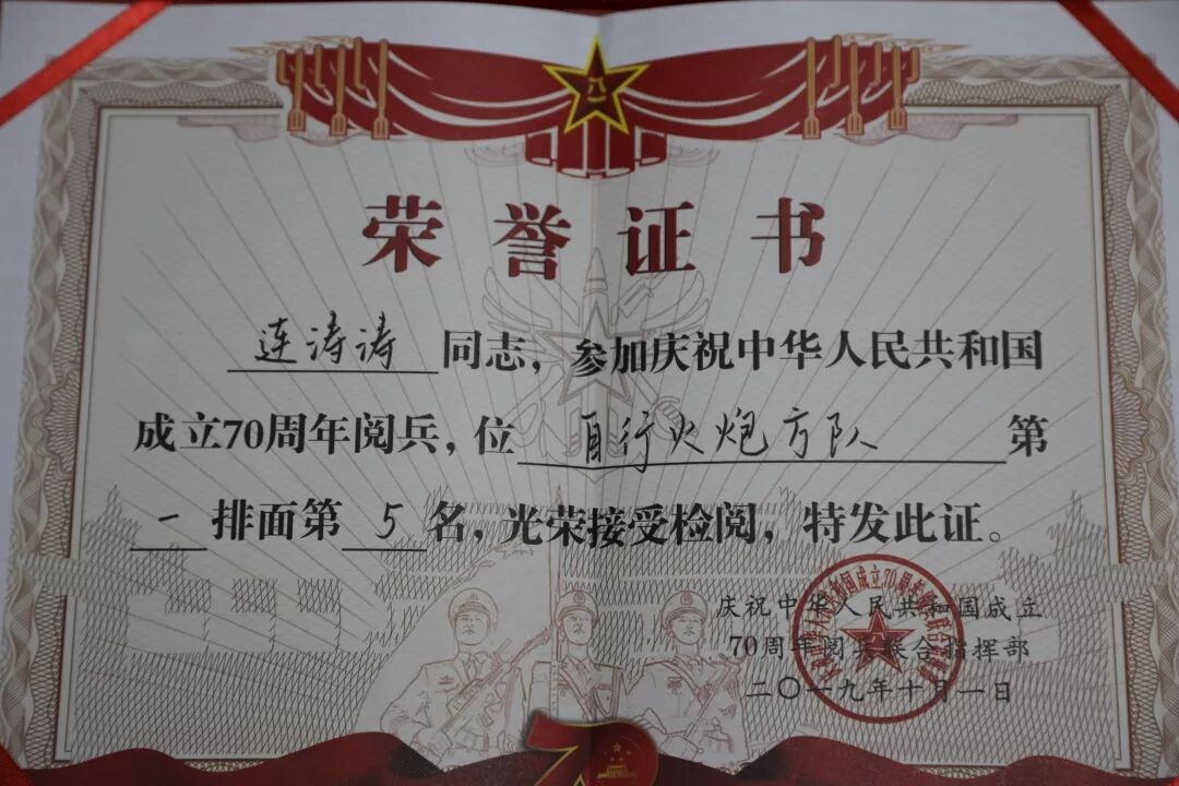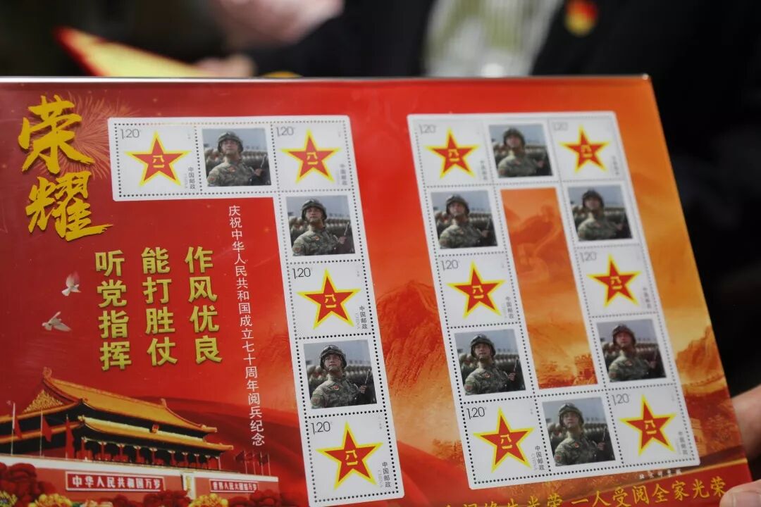 几个月下来,1米86的身体瘦了10多斤,却终于走上了天安门广场,接受祖国和人民的检阅,展示了国威军威,被评为阅兵先进个人,受阅的个人照片还和八一军徽一起,被国家邮政总局印制成庆祝中华人民共和国成立七十周年阅兵个人纪念邮票。