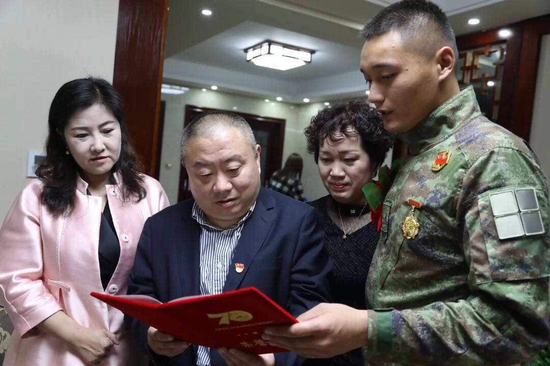 2019年10月24日,江苏丰县退役军人事务局工作人员登门慰问参加国庆阅兵载誉归来的军人连涛涛,并为他献上鲜花。