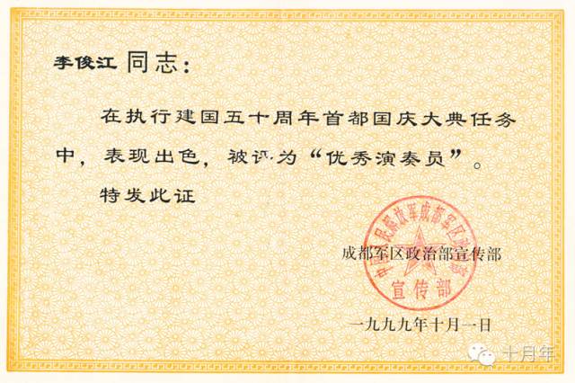 同时,积极完成部队首长在各个时期交给的演出任务,均得到首长和同志们的好评。1999年4月,他很荣幸地被选拔到建国五十周年国庆阅兵联合军乐团执行演奏任务,在联合军乐团一大队担任打击乐声部长,10月1日在北京天安门广场接受了中华人民共和国主席、中央军委主席江泽民的检阅。2009年4月,他又再一次荣幸地被选拔到建国六十周年国庆阅兵联合军乐团执行演奏任务,担任军乐团成都军区代表队打击乐声部长,10月1日在北京天安门广场接受了中华人民共和国主席、中央军委主席胡锦涛的检阅。