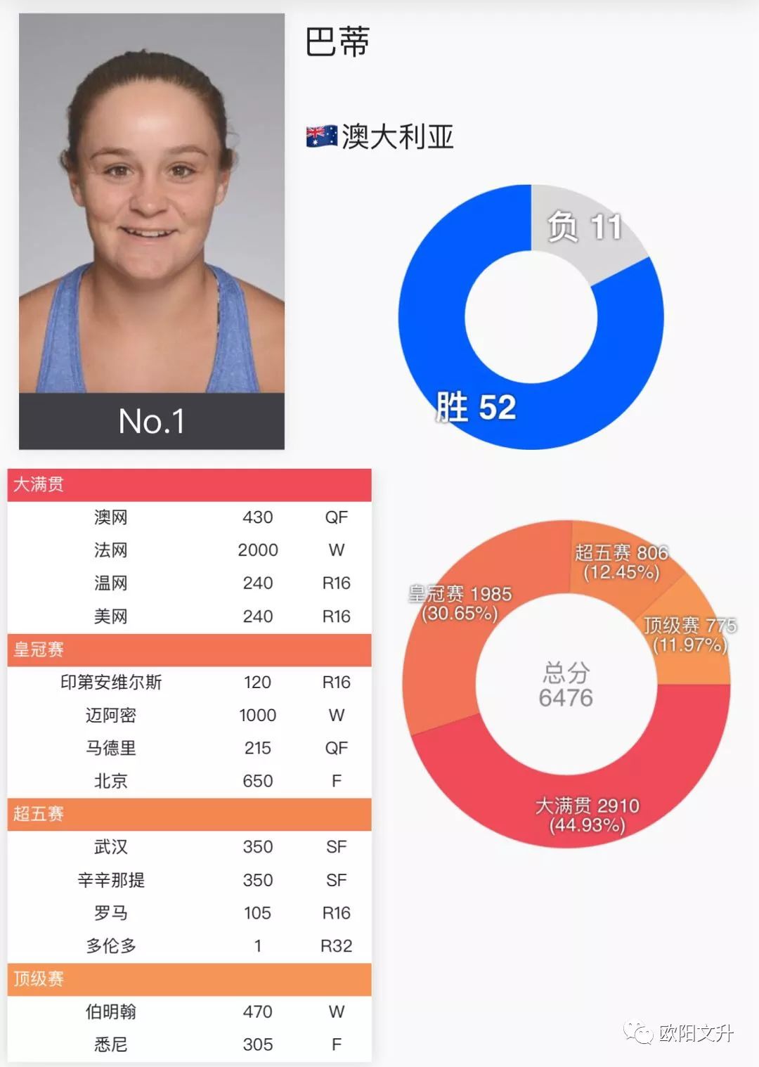外形酷似乡村爱情经典人物谢大脚的澳大利亚少女巴蒂今年战绩赫赫,法网夺冠、迈阿密折桂、伯明翰问鼎,虽然只有三个冠军,但是平稳的发挥让曾经的板球少女又是拿大满贯又是登顶世界第一。
