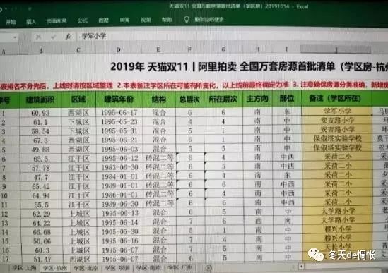 消息一出,网上还流出一份“天猫双11丨阿里拍卖全国万套房源首批清单”的截图,包括房源的区域位置、建筑面积、建筑年份等信息,说得有鼻子有眼。