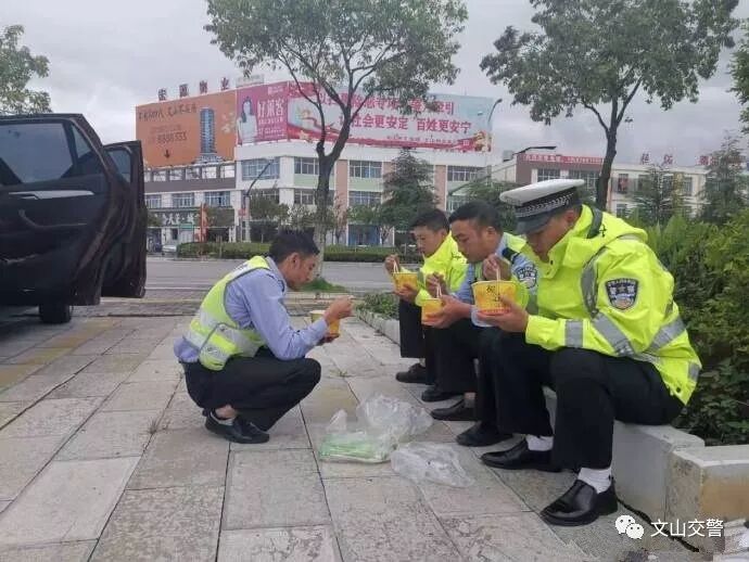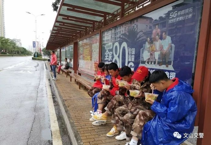 从上午7点到19点,12小时不间断的冒雨巡逻劝导,他们只有短暂的15分钟吃饭时间,公交车站台的长椅、路边的花台就是他们餐桌,虽然辛苦,没有一个人有怨言。