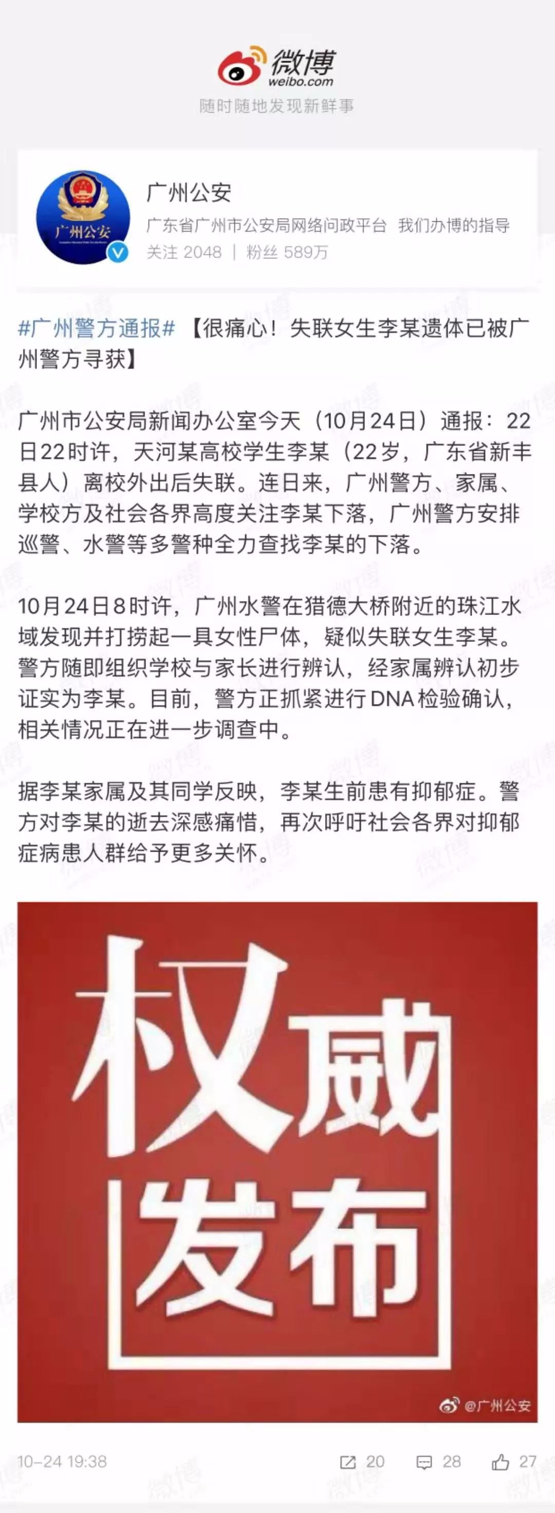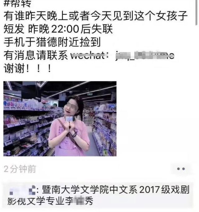 10月22日22时左右,暨南大学文学院中文系2017级戏剧影视文学专业学生李某秀在离开校园后失联。其同学表示,李某秀在离开校园时曾在微信上联系舍友帮忙留门,但彻夜未归。