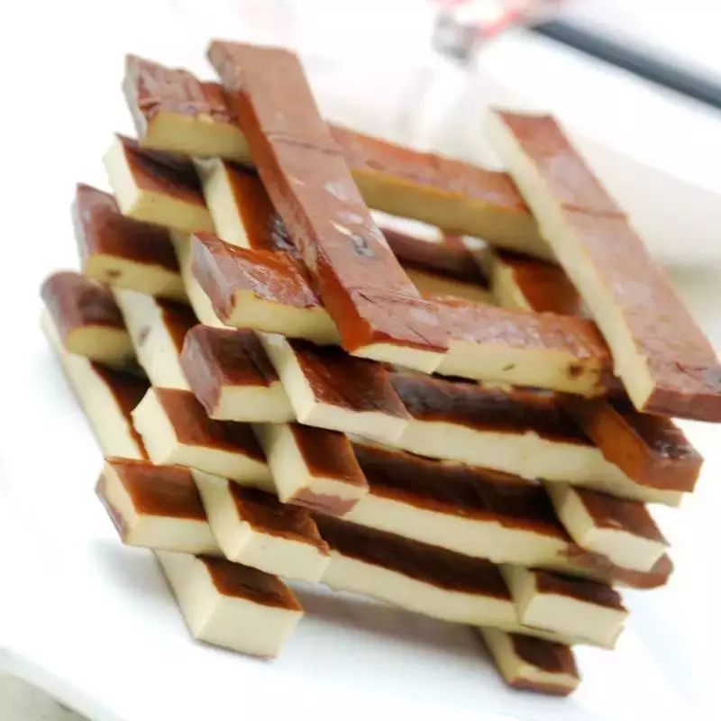 豆制品中最受欢迎的是五香茶干,呈红褐色,酱香浓郁,入口紧致柔韧,回味绵长。但私下以为,桥林豆干最绝味的,却是那细腻的臭豆腐干。桥林的臭豆腐干,并不似别处的臭豆腐恣意散发着嚣张的臭味,它内含一种淡淡的鲜香显得内敛而温和,豆干方方正正,清淡的青灰色,内里月白细腻。那感觉像是明清的建筑,青砖黛瓦,粉墙隔窗,晴朗疏阔。又像是一位身着青色长衫的清癯书生,安静地立于石碛河畔,微风吹过,长衫轻飘,露出月白色的内襟,令人心中无端升起《诗经》中“青青子衿”的意境。