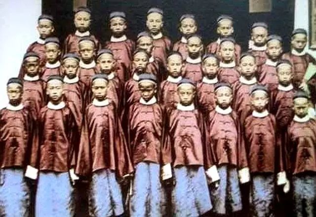图为中国派遣到美国的第一批小留学生,图中每个人都戴着瓜皮帽,蓝长袍红马褂,离家难免有不舍的情绪,拍照都没有笑容。他们想到要去往相隔千里的远方,有些悲伤。