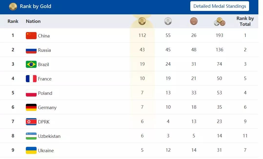 目前还有两个比赛日,还有羽毛球,乒乓球,大球项目等待中国去争冠,中国队在金牌榜的领先优势无可动摇。而第二名的俄罗斯还只拿到了43金,第三的巴西也只有19枚金牌。美国有些尴尬,至今0金,恐怕这将是军运会的另外一个看点了。