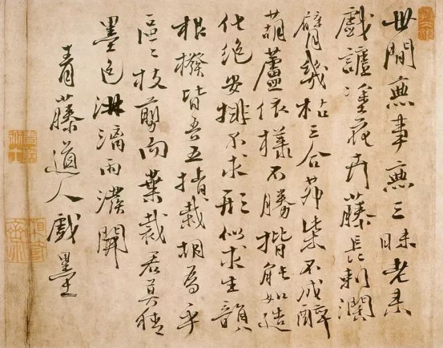 徐渭,1521年-1593年,明代著名文学家、书画家。与解缙、杨慎并称“明代三大才子”。徐渭的书法和明代早期书坛沉闷的气氛对比显得格外突出,他最擅长气势磅礴的狂草,但一般人很难看懂,用笔狼藉,他对自己的书法极为喜欢,自己认为“书法第一,诗第二,文第三,画第四”。