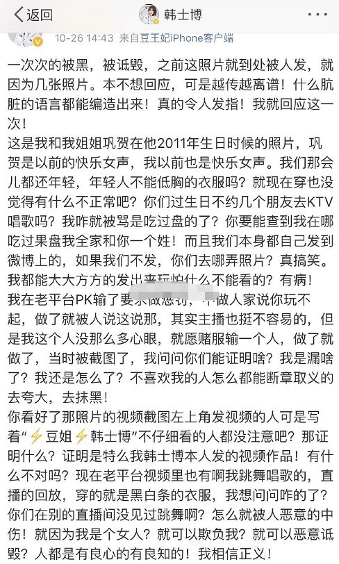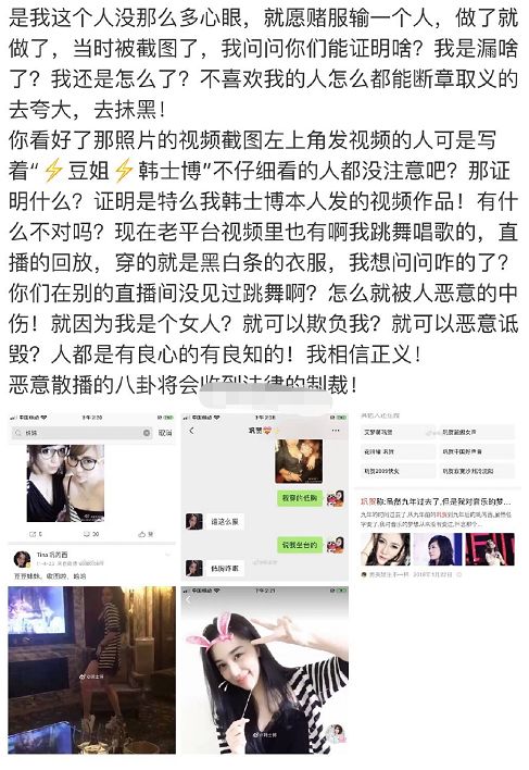 由于骡子爆发文爆豆姐负面照片,于是豆姐韩士博刚刚发文解释,称低胸照是11年和闺蜜拍的,非常正常的拍摄并不是什么夜总会上班照片,还有露大腿的也是自己玩耍时发的视频,结果被某些人恶意中伤恶意诋毁,这些人将受到法律的制裁!