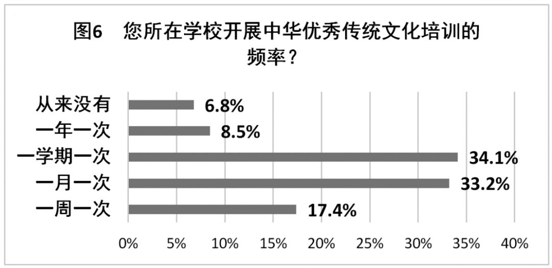 从图6可以看到,多数学校开展中华优秀传统文化培训的频率并不高,在与个别班主任的访谈中也了解到,各级教研和培训中关于“中华优秀传统文化”的培训比较少,就算有相关培训,内容和形式也比较单一,教师们大多时候都处于自我摸索的状态。校外相关培训,由于有名额限制,覆盖面窄,受益教师人数较少。在访谈中,部分教师表达了若要参与区域培训,由于路上占用时间过长,因而不是很愿意参加。