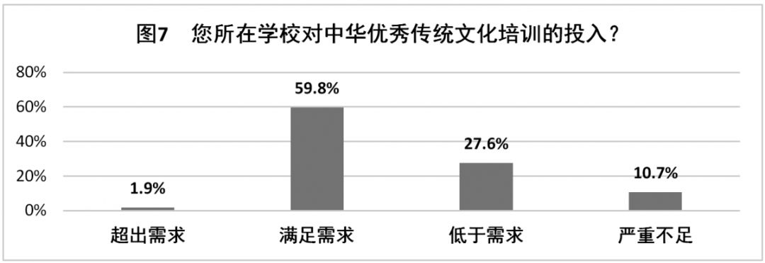 从图7中可以看到,相当一部分学校对教师中华优秀传统文化素养的投入出现超出需求、低于需求或投入严重不足的现象。部分班主任表示学校中华优秀传统文化氛围不浓厚。这都反映出多数学校没有对中华优秀传统文化教育提前进行充分、合理的规划,从而导致资源配置的不均和浪费。