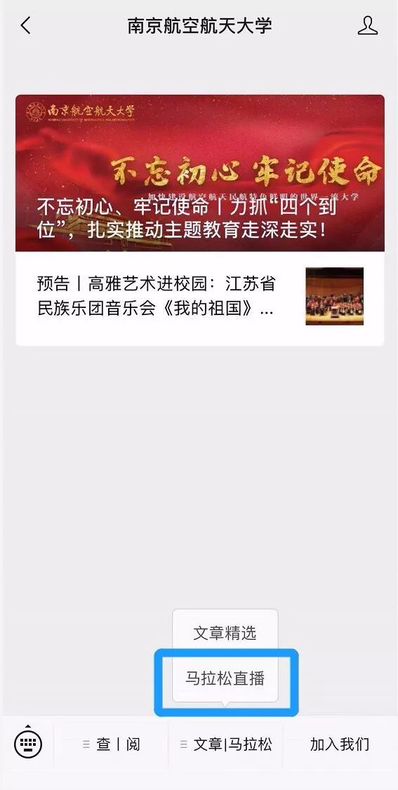 明日,校园马拉松将通过官方微信公众平台进行直播关注“南京航空航天大学”官方微信点击自定义菜单“马拉松直播”即可观看哦