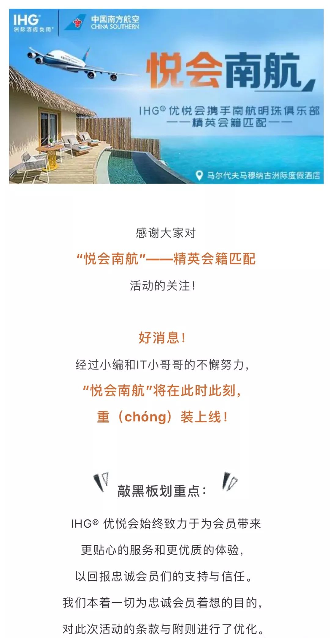 前阵子,一个本来定向部分有资格的公司的账号才能参与的IHG至悦会员挑战活动出现了严重的BUG:只要是用活动链接注册,无论什么账号都能秒升IHG至悦会员。而紧接着南航和IHG的会员匹配活动中,至悦会员能匹配到南航金卡,并且只需要2或者4个航段就能完成一年的续期。这个活动可以说是继前年万豪白金匹配东航银卡之后最厚道的会籍匹配活动,