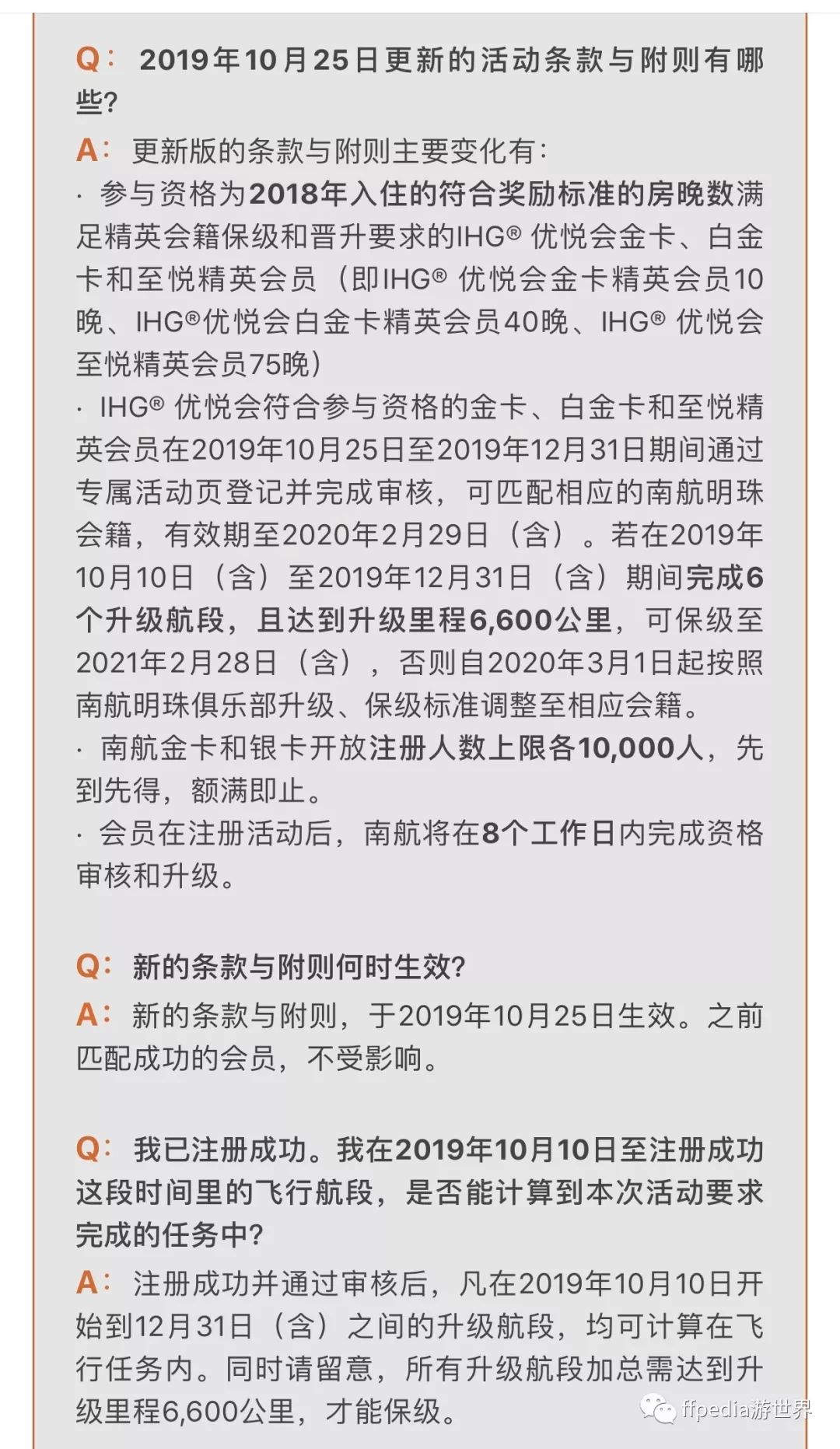 然而,IHG和南航显然是因为自己漏洞被钻而恼羞成怒,干脆趁这个机会连带着把正常的活动条款也更改了!在最新出炉的活动条款中,只有在2018年达到了会员定级房晚的硬住出来的IHG白金卡才能匹配南航金卡,并且续期的标准由单纯的航段变成了年底前累计6个航段外加6600公里定级里程。并且参与人数限制在了前10000名。