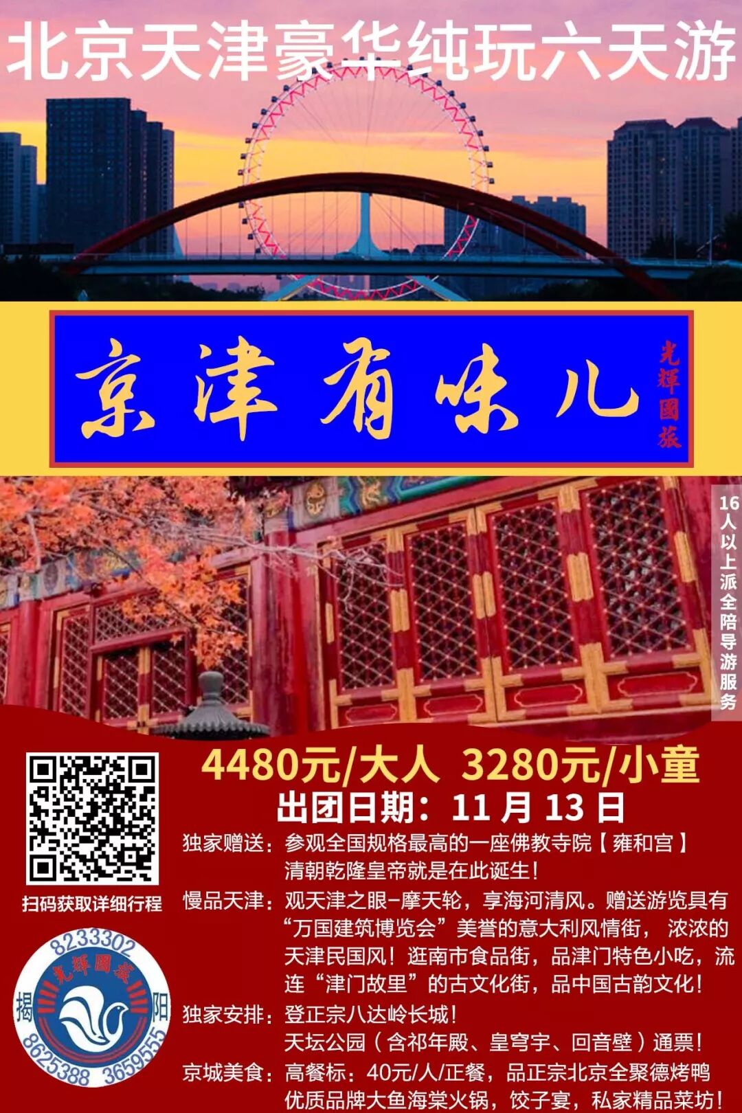 第五天:(含早/午/晚餐自理) 宿:天津早餐后前往参观香火最旺的藏传佛教圣地【雍和宫】祈福(1小时),在皇家寺院中祈福求健康;位于北京市区东北角,清康熙三十三年(1694年),康熙帝在此建造府邸、赐予四子雍亲王,称雍亲王府。乘车前往天津(2.5小时),参观天津【文化街】津门故里发源地,仿古一条街,体现天津文化的源远流长。天津小吃,天津泥人张泥塑娃娃都代表了浓浓的津门文化。海河畔远观【天津之眼】全称天津永乐桥摩天轮,坐落在天津市红桥区海河畔,是一座跨河建设、桥轮合一的摩天轮,兼具观光和交通功用。是世界上唯一建在桥上的摩天轮,是天津的地标之一。【食品街】南市食品街,津门饮食特色风味一条街,几百种风味独特的津门小吃(麻花,皮糖,鱿鱼丝等),津门独具美食特色。入住酒店。