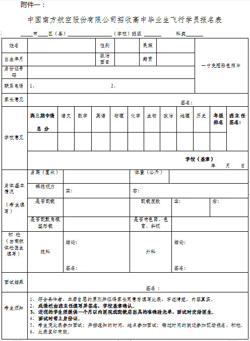 4、初检时学生须持本人身份证和《中国南方航空股份有限公司招收高中毕业生飞行学员报名表》(附件一),一寸近照贴在报名表上。近视的学生请在初检时准备好近一个月内的视力验光单(医院和眼镜店均可)。面试、初检不收费,大体检费用由南航负责,医院的辅助检查费由学生本人承担。
