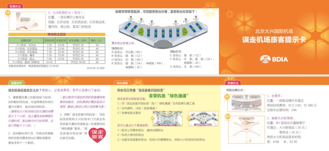 3、误走机场旅客可在航空公司票务柜台、值班经理柜台、机场大使问讯柜台、出租车旅客服务柜台、机场大巴售票柜台、地铁大兴机场线问讯柜台等处,领取“误走机场旅客识别标签及提示卡”,大兴机场和首都机场值机、安检、大使等关键岗位员工可在主动发现或旅客寻求帮助后,提供专门为误走机场旅客开通的快速转运/快速登机“绿色通道”以及优先值机、过检(急客通道)和免费电瓶车等服务。