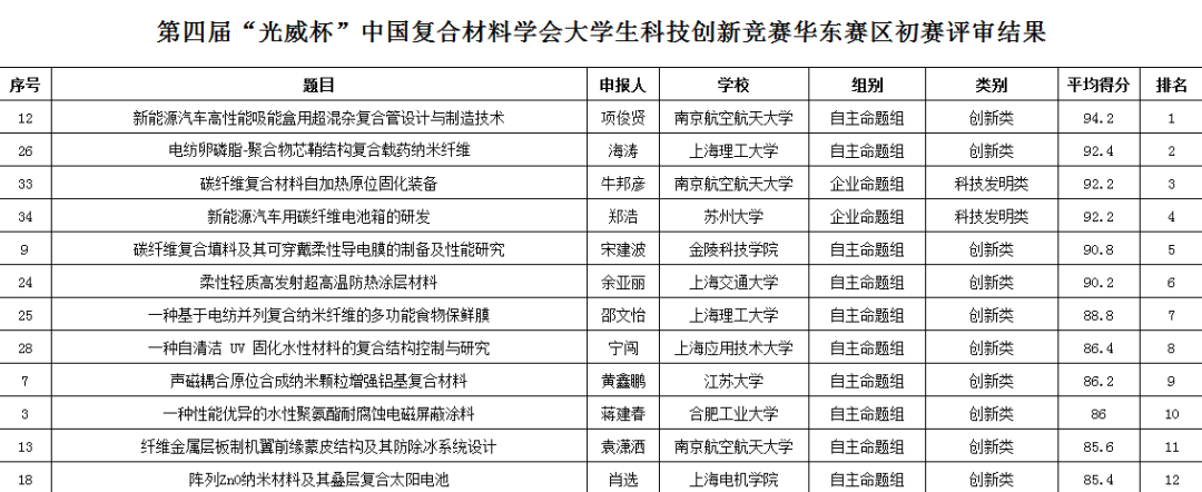 此次初赛华东赛区收到来自19所院校共计34份作品。经过评审老师的认真审核、讨论、评分,最终确定12份晋级作品分别为南京航空航天大学的《新能源汽车高性能吸能盒用超混杂复合管设计与制造技术》、上海理工大学的《电纺卵磷脂-聚合物芯鞘结构复合载药纳米纤维》、南京航空航天大学的《碳纤维复合材料自加热原位固化装备》、苏州大学的《新能源汽车用碳纤维电池箱的研发》、金陵科技学院的《碳纤维复合填料及其可穿戴柔性导电膜的制备及性能研究》、上海交通大学的《柔性轻质高发射超高温防热涂层材料》、上海理工大学的《一种基于电纺并列复合纳米纤维的多功能食物保鲜膜》、上海应用技术大学《一种自清洁 UV 固化水性材料的复合结构控制与研究》、江苏大学的《声磁耦合原位合成纳米颗粒增强铝基复合材料》、合肥工业大学的《一种性能优异的水性聚氨酯耐腐蚀电磁屏蔽涂料》、南京航空航天大学的《纤维金属层板制机翼前缘蒙皮结构及其防除冰系统设计》、上海电机学院的《阵列ZnO纳米材料及其叠层复合太阳电池》(以最终评分从高到低排序)。