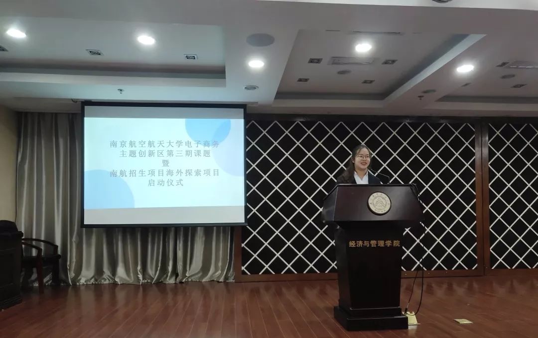 2019年10月24日,电子商务主题创新区第三期课题暨南航招生项目海外探索项目启动仪式在经济与管理学院辅楼A0305成功举办。经济与管理学院邓晶副院长、国际教育学院李勇副院长、江苏未迟数字有限公司董事长王安霞女士、教务处赵子玥老师、电子商务主题创新区负责人刘丽丽老师以及校内企业各位指导老师一同出席了本次启动仪式。