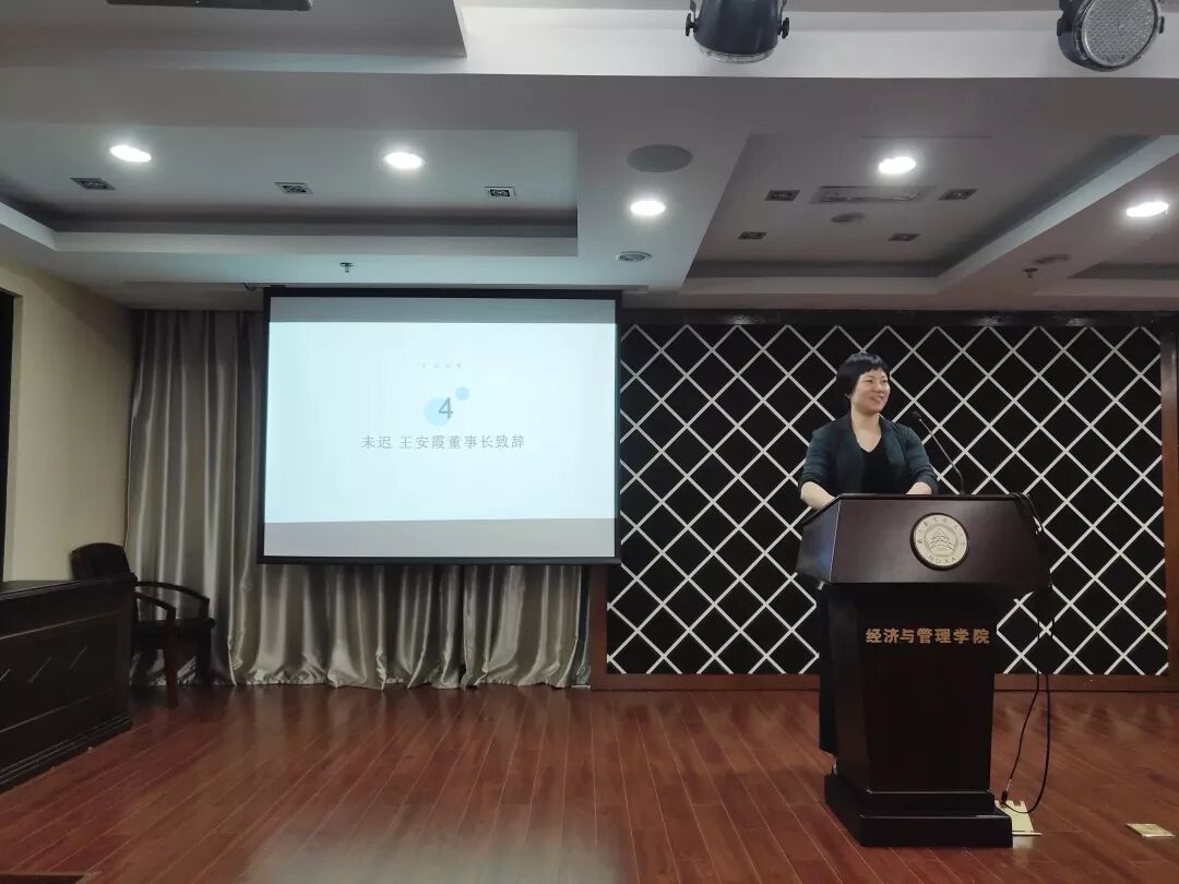 紧接着,江苏未迟数字有限公司董事长王安霞女士结合自己的经历讲述了时代变迁和社会发展的趋势。她总结到:“这是一个最好的时代,互联网已经成为基础设施高端服务业是一种趋势。”王安霞女士的发言得到了与会人员的一致认可,同学们的掌声便是最好的证明。