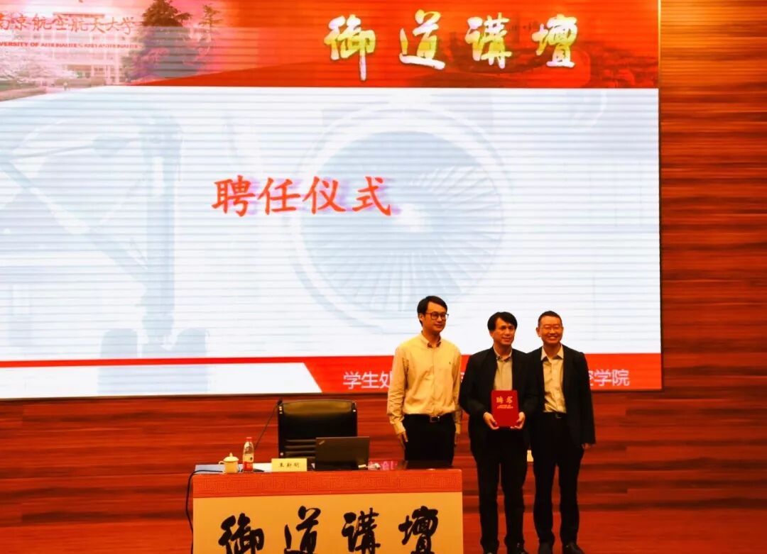 讲座前,蒋彦龙、王中叶为王新明颁发聘书,聘请王新明先生为我校“长空学院、能源与动力学院企业思政导师”。
