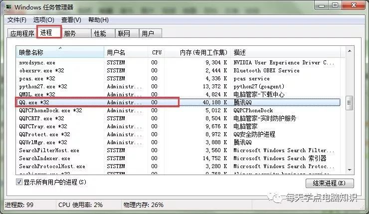 3、进程下显示了所有当前正在运行的进程,包括应用程序、后台服务等,如QQ.exe(腾讯QQ)、360SE.exe(360安全浏览器)、Thuder.exe(迅雷)等;