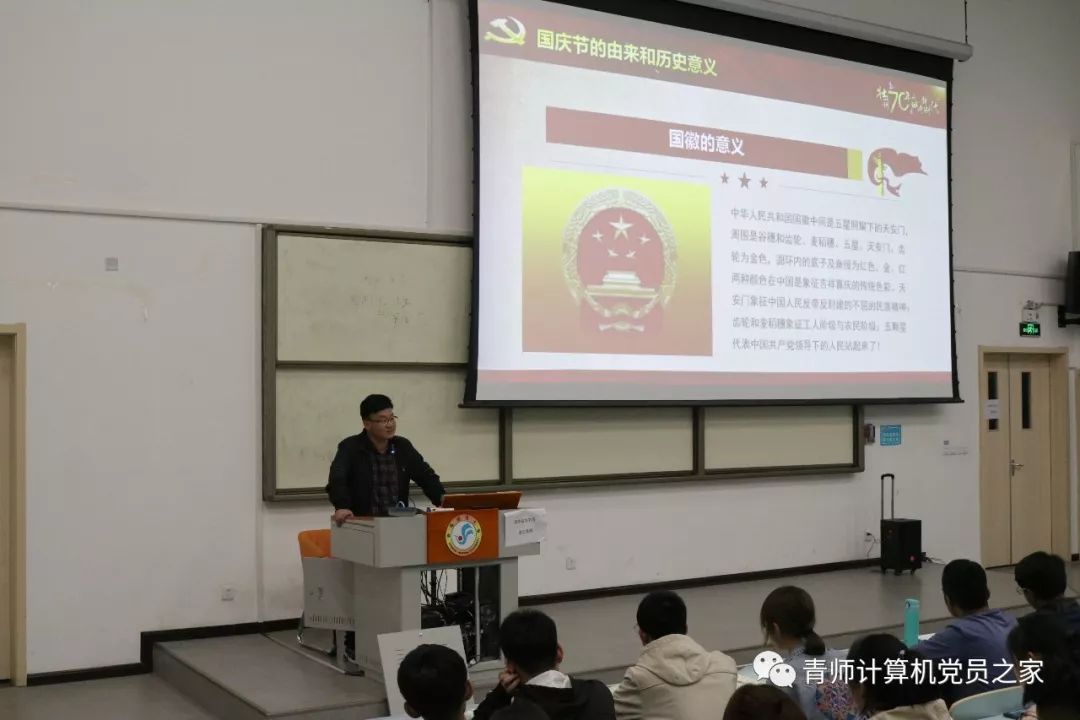 为落实《关于在“不忘初心、牢记使命”主题教育中认真学习党史、新中国史的通知》精神,将中国特色社会主义核心价值体系融入学生教育,进一步激发广大学生爱党、爱国的热情,10月21日晚,计算机学院在西二楼225教室举办了题为《壮丽七十载奋进新时代》专题讲座。由学生党支部书记、辅导员田正雄主讲,学生党员、积极分子和19级全体学生参加。