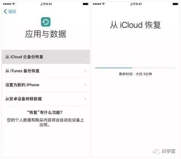 接下来会自动进入一个“应用与数据”的新界面,我们选择“从iCloud云备份”恢复,登录Apple ID,选择【从iCloud云备份恢复】,选择需要恢复的iCloud云备份后,静待数据恢复,然后iCloud就会恢复数据到我们手机上了。