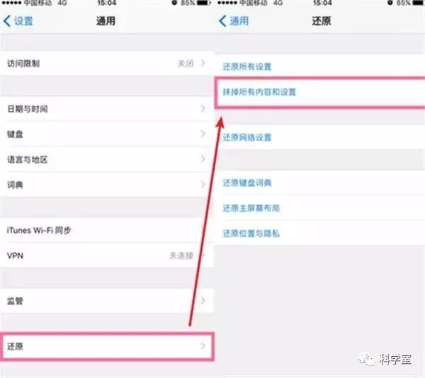 恢复iCloud备份的前提是需要重新激活我们的iPhone手机,首先第一步是抹除当前手机上的所有数据。具体操作步骤是:进入【设置】→【通用】→【还原】,点击“抹除所有内容和设置”。