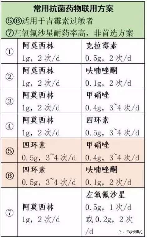 初次治疗:国内推荐的抗菌药物联用方案有7个(见下表),根除率85~94%。临床应根据药物禁忌症、抗菌药物应用史等,选择其中的1个方案。