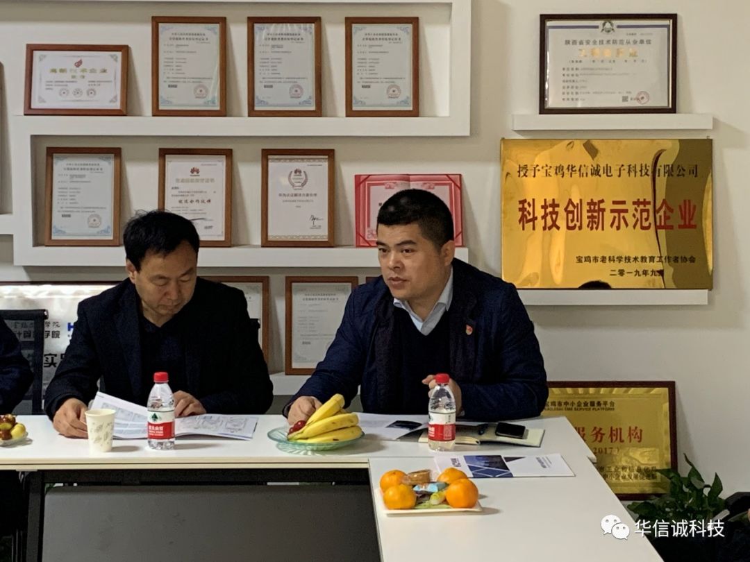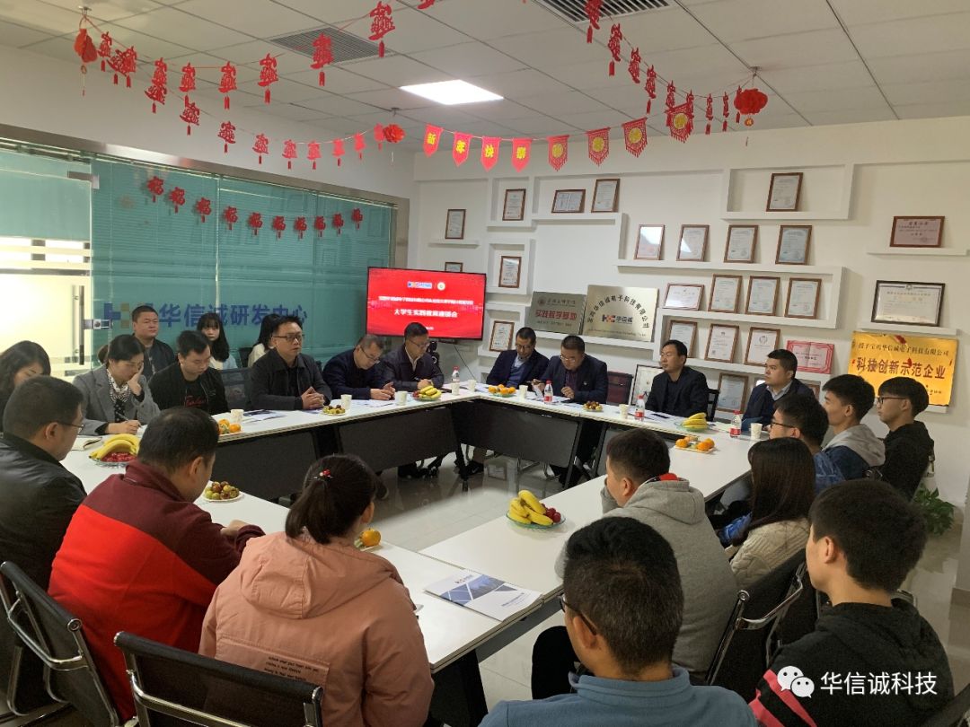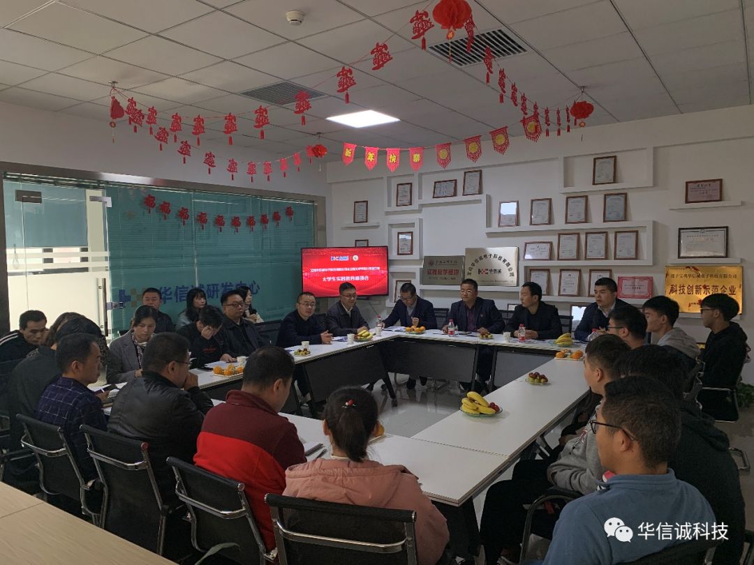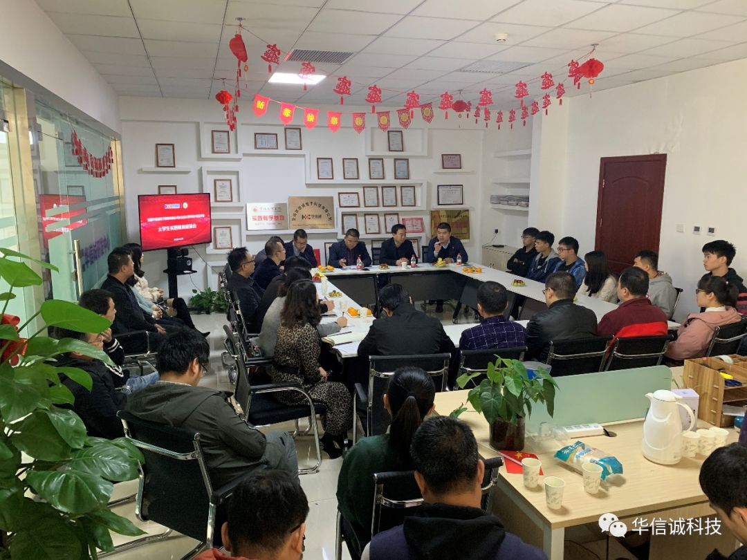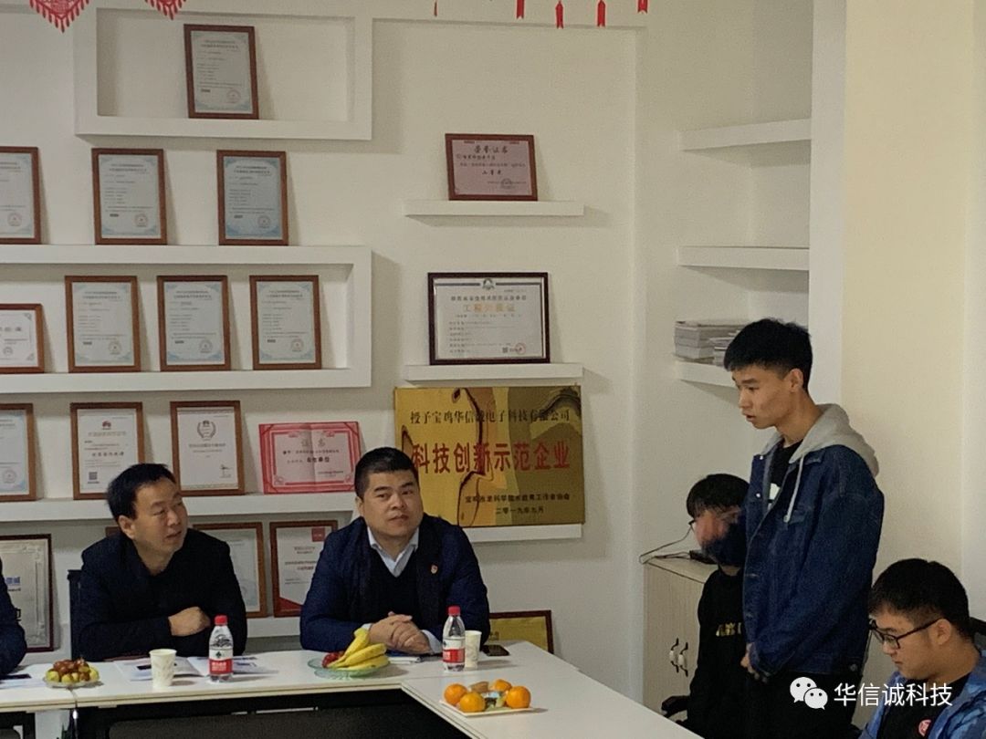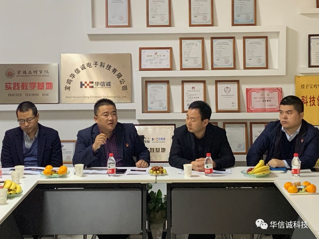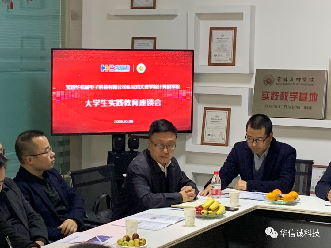 2019年10月26日上午, 宝鸡华信诚电子科技有限公司&宝鸡文理学院计算机学院大学生实践教育座谈会在宝鸡华信诚电子科技有限公司十楼研发中心顺利召开!宝鸡文理学院党委学工部部长、学生处处长冯森、宝鸡文理学院教务处副处长张俊辉、宝鸡文理学院计算机学院党委副书记任海卫、宝鸡文理学院计算机学院副院长张光南、渭滨区互联网产业园主任、联合支部书记庞宁康、宝鸡华信诚全体员工、宝鸡文理学院计算机学院第三批优秀学生实践代表参加了本次座谈会。