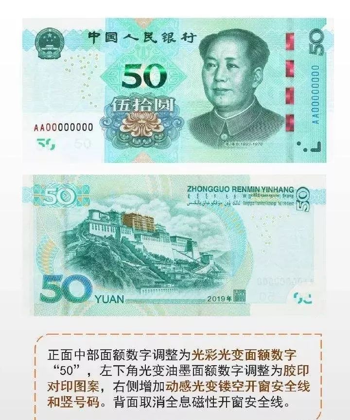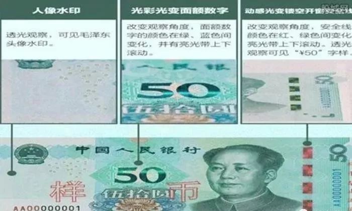 二,看开窗安全线。之前老版人民币就有开窗防伪线,但是新版在此基础上又增加了光变镂空技术。除了从正面透光看可以清晰看到金额面值如50之外,现在改变钞票观察角度,可以明显发现安全线的颜色可以在红色和绿色之间交替变化,并且有一条亮光带上下滚动。新版20元10元纸币也采用了这种技术。
