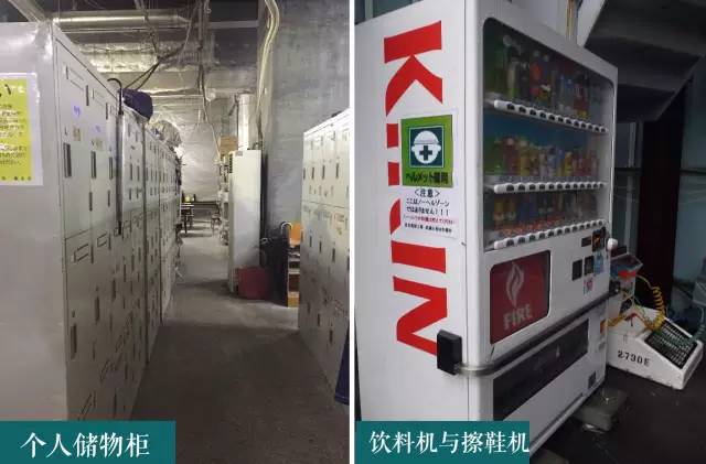 工地现场入口有专门的更换作业装备的场所,休息区还有个人储物柜,工人无需自带工具前往。