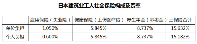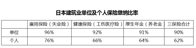 日本建筑业从业人员三种保险的缴纳费用,由公司与个人各自缴纳月收入的15%左右 。