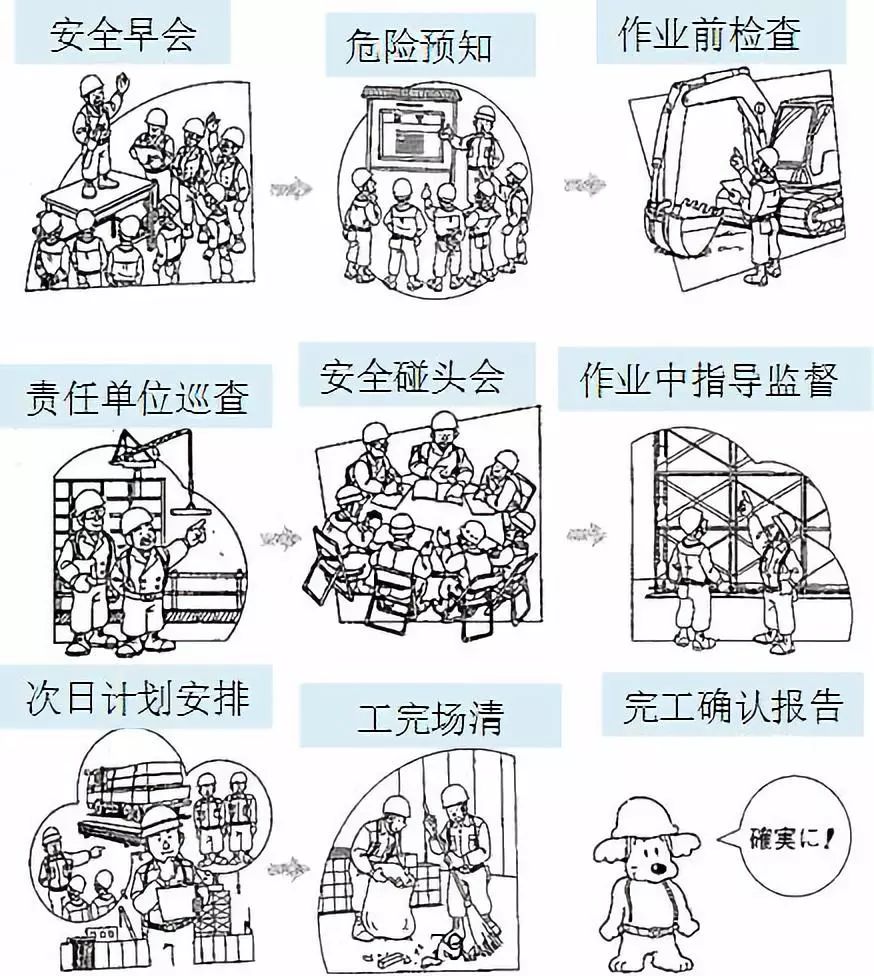 ● KY活动(危险预知):让作业人员认识到危险源及当天的重点项目,从而做到在作业之前充分解决问题的训练。全员参与、全员提出、全员解决,上墙展示并每日存档。