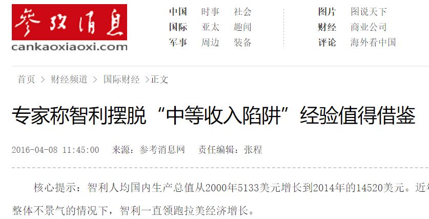 而就在三年前,智利还被主流经济学界树立为成功摆脱“中等收入陷阱”的自由市场经济体的典范——智利人均国内生产总值从2000年5133美元增长到2014年的14520美元。